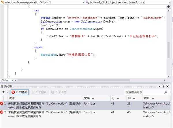 解决方案 8 using system.data.sqlclient; 8 using System.Data.SqlClient; 加一句这个引用 8 在报错的地方点右链,再点解析 8 添加一下引用就好了,你的sqlconnection是手打上去的吧。 8 加sqlclient引用。右击它应该有提醒的 CodeBye 版权所有丨如未注明 , 均为原创丨本网站采用BY-NC-SA协议进行授权 , 转载请注明连接数据库的时候碰到的问题,麻烦各位给解答下! 喜欢 (0)赏[1034331897@qq.com]分享 (0)