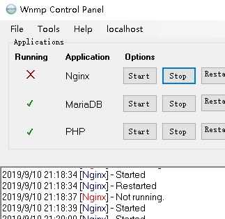 平时用的系统都是Windows 10,准备搭建一个Nginx、MariaDB 、PHP的环境用于学习、开发和测试。为了便捷,使用了网上的一键安装包 wnmp,当前的版本是Wnmp-3.2.2.exe。根据安装向导安装完成后,启动。问题来了。php和mariadb的服务都正常启动了,只有nginx 一直无法启动。