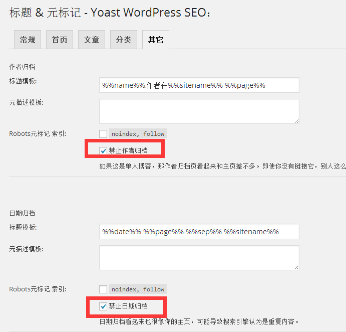 接上篇《WordPress SEO by Yoast 插件使用教程详解一》 其他选项:下图红色框部分的选项需要注意,如果你是个人站长,只有一个人在更新文章的,那么请勾选,如果有很多编辑一起更新文章,那么就不用勾选这些项。关闭日期归档的优点是可以避免搜索引擎收录对用户无用的内页,同时收缩权重,保证重要的页面权重不会被分散。